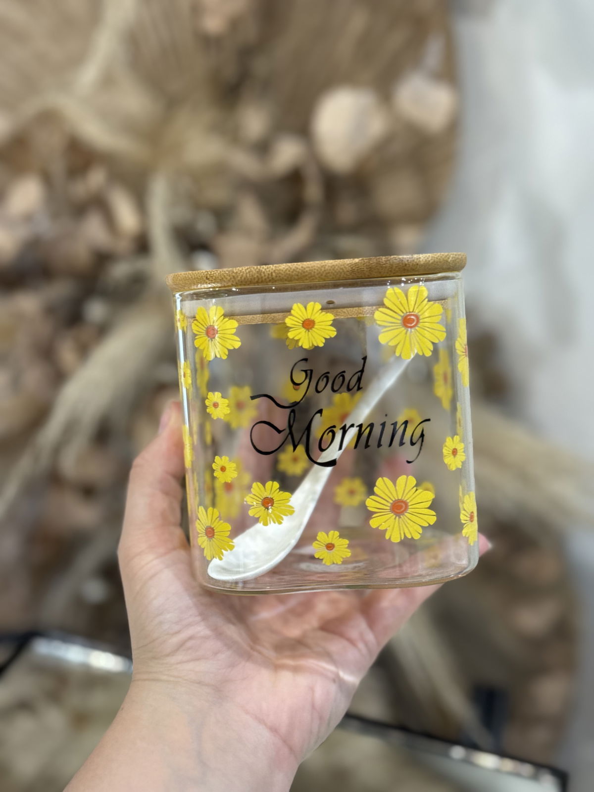 Azucarera de vidrio con tapa de bambu y cucharita de ceramica! estampado de flores