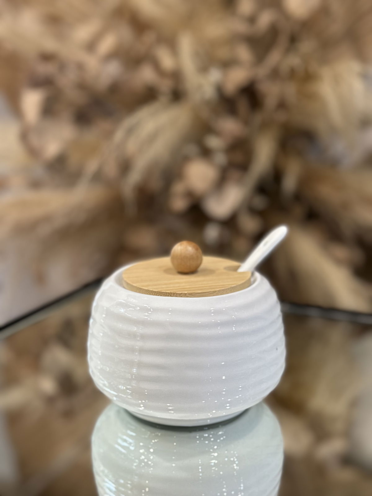 Azucarera de ceramica con tapa de bambu y cucharita de ceramica!