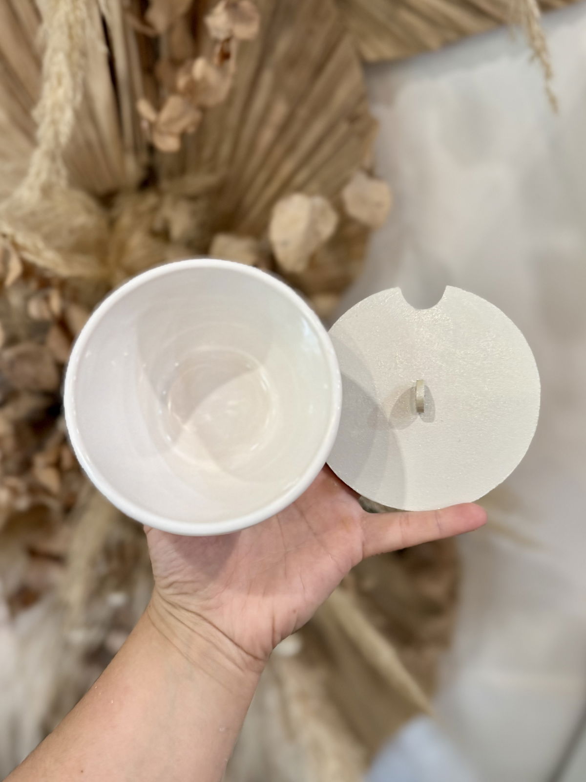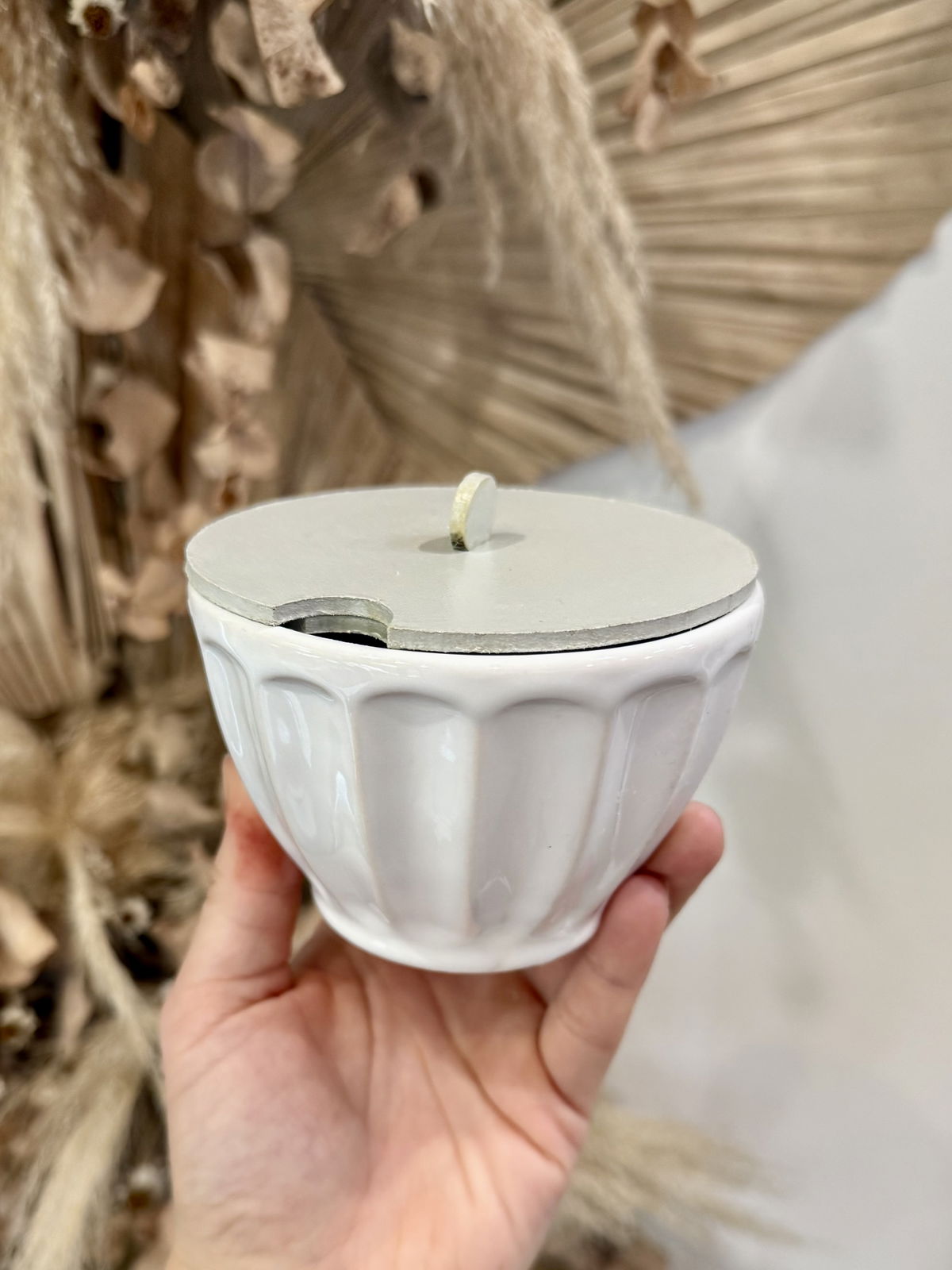 Azucarera de cerámica con tapa de madera, tra el huequito para la cuchara! Diseño calado, color blanco