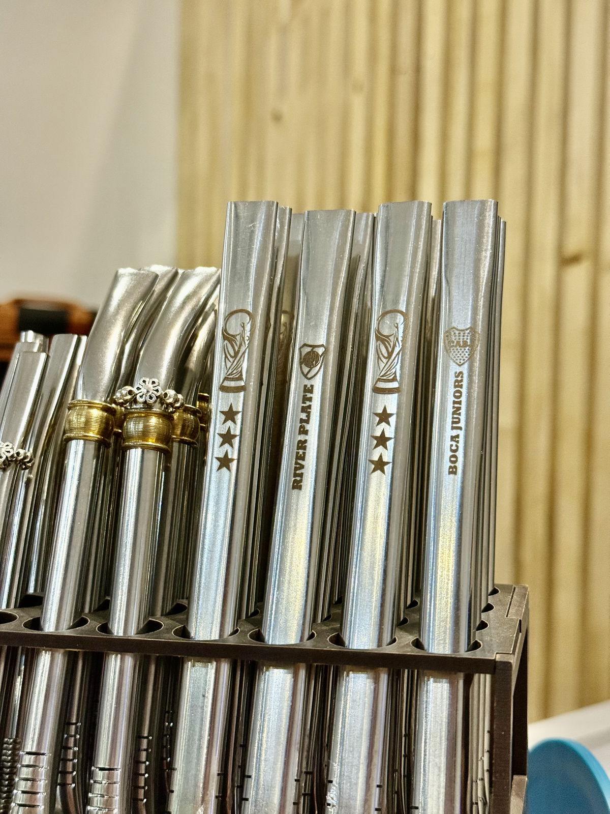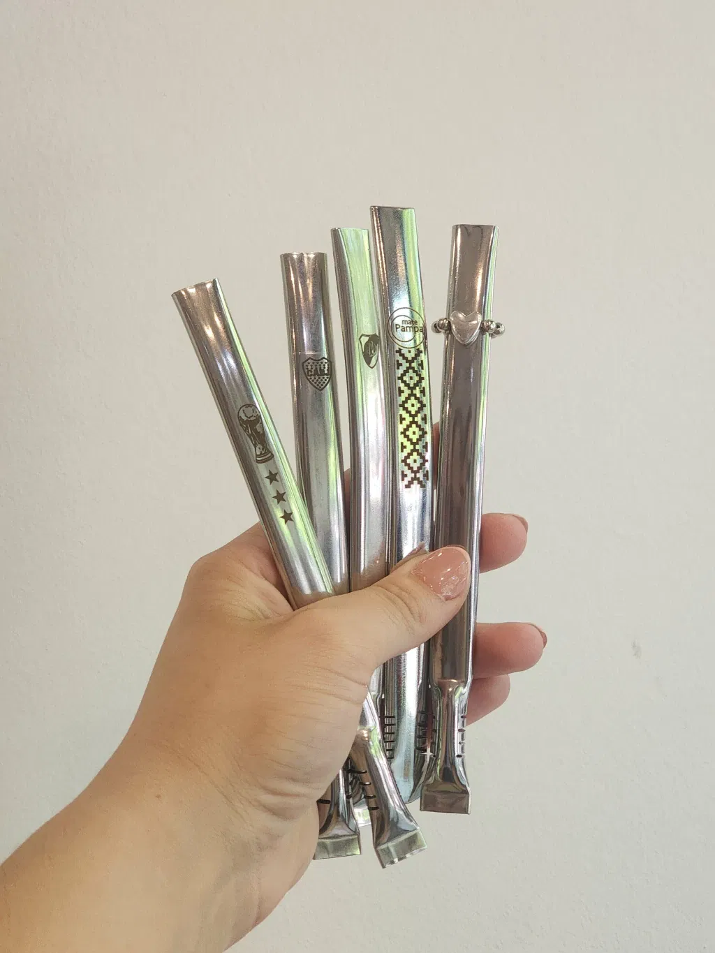 Bombillas de acero inoxidable ranuradas y grabadas con diferentes motivos. Corazones, estrellas, mate luego existo, guarda pampa.