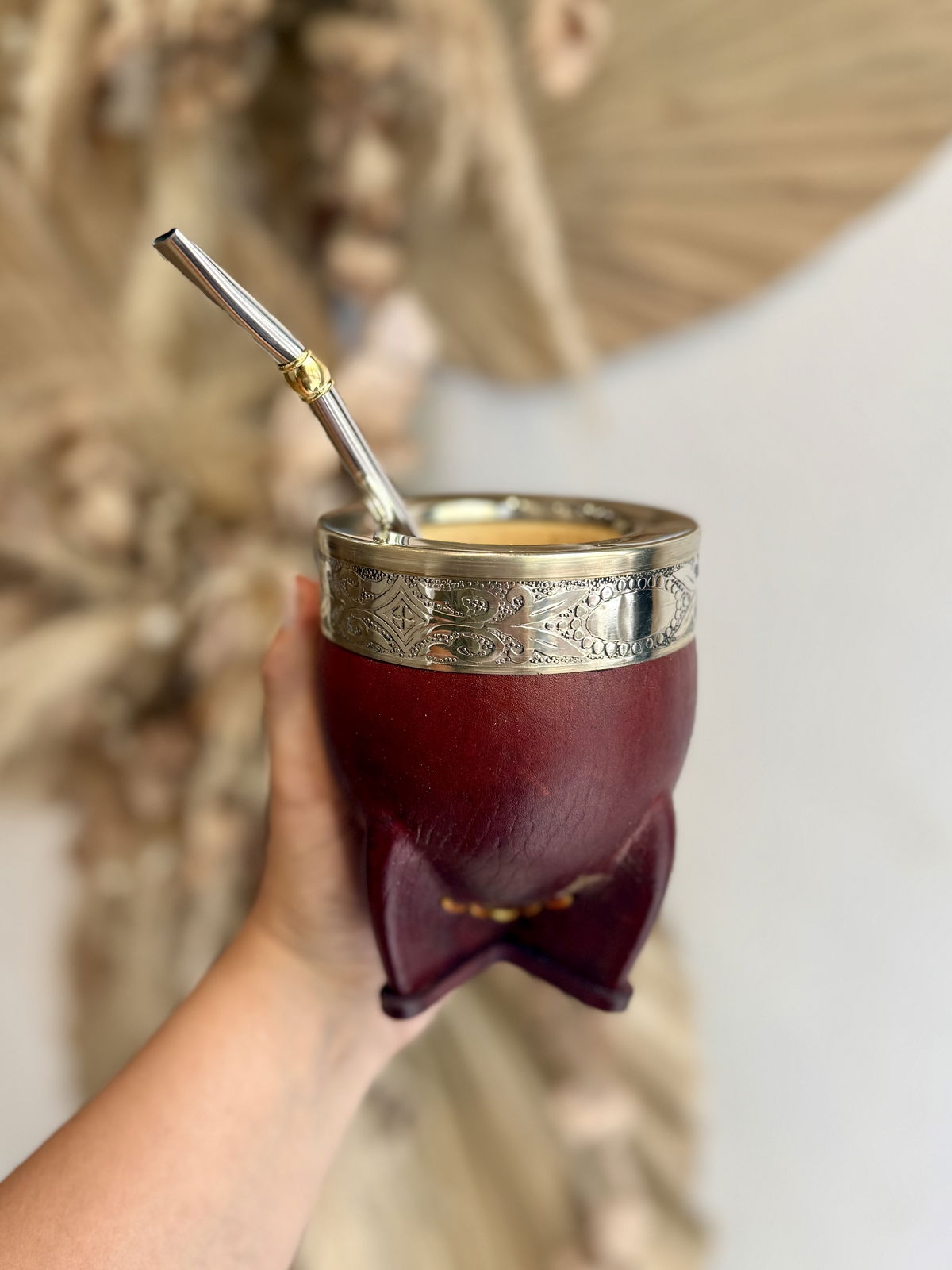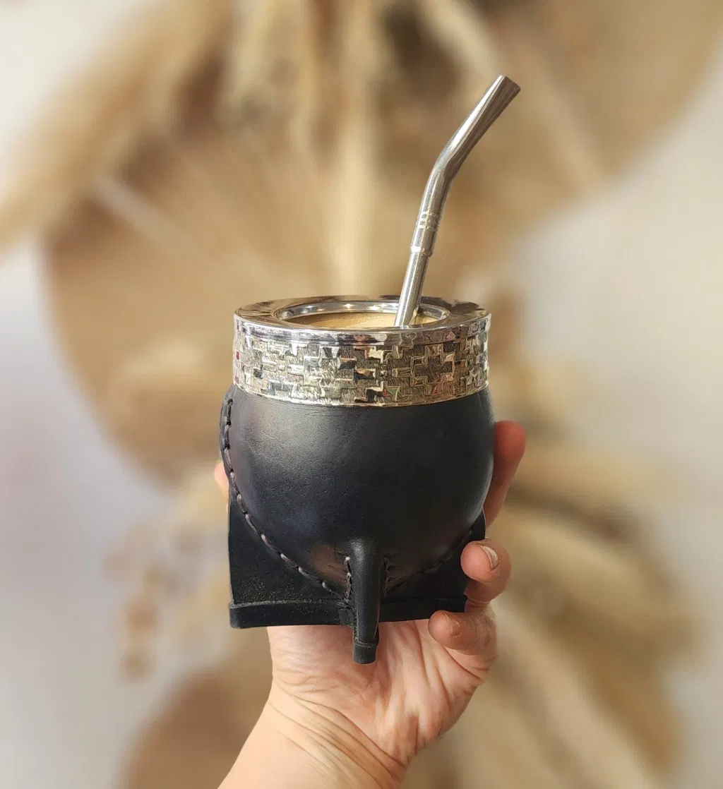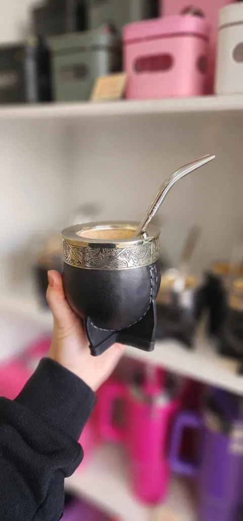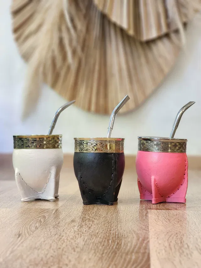 - Materiales: cuero vacuno en su exterior, virola de ALPACA grabada/cincelada y su interior es de calabaza brasilera (se cura)