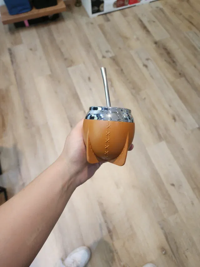 Su forma y elegancia remite al mate de cuero, con sus correspondientes costuras.