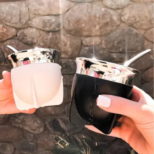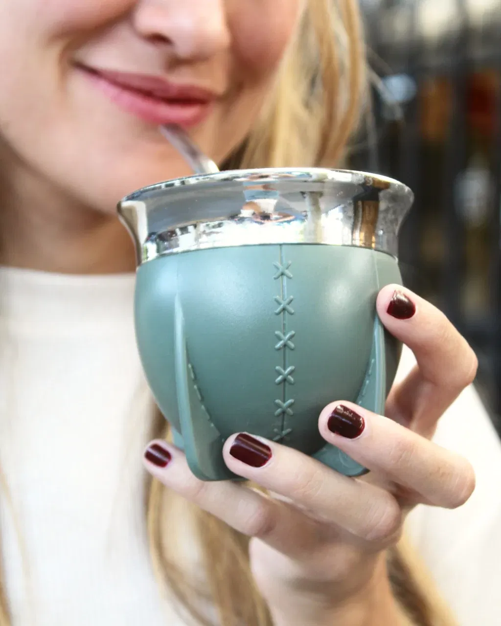 Su forma y elegancia remite al mate de cuero, con sus correspondientes costuras.