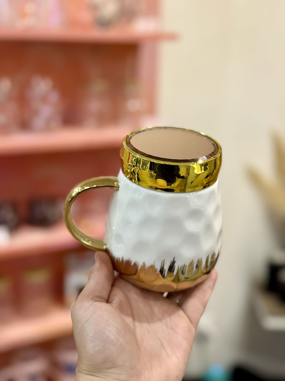 Taza de cerámica blanca con detalles dorados!, incluye tapa a rosca con espejito, ideal para que no se enfrien tus bebidas