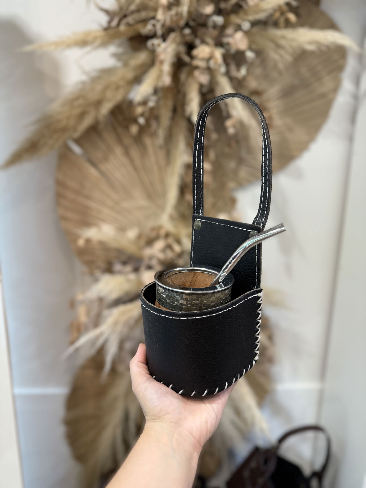 Es de cuerina y carton forrado (rigido), te sirve para mates grandes, chicos, mate listo, vasos, etc