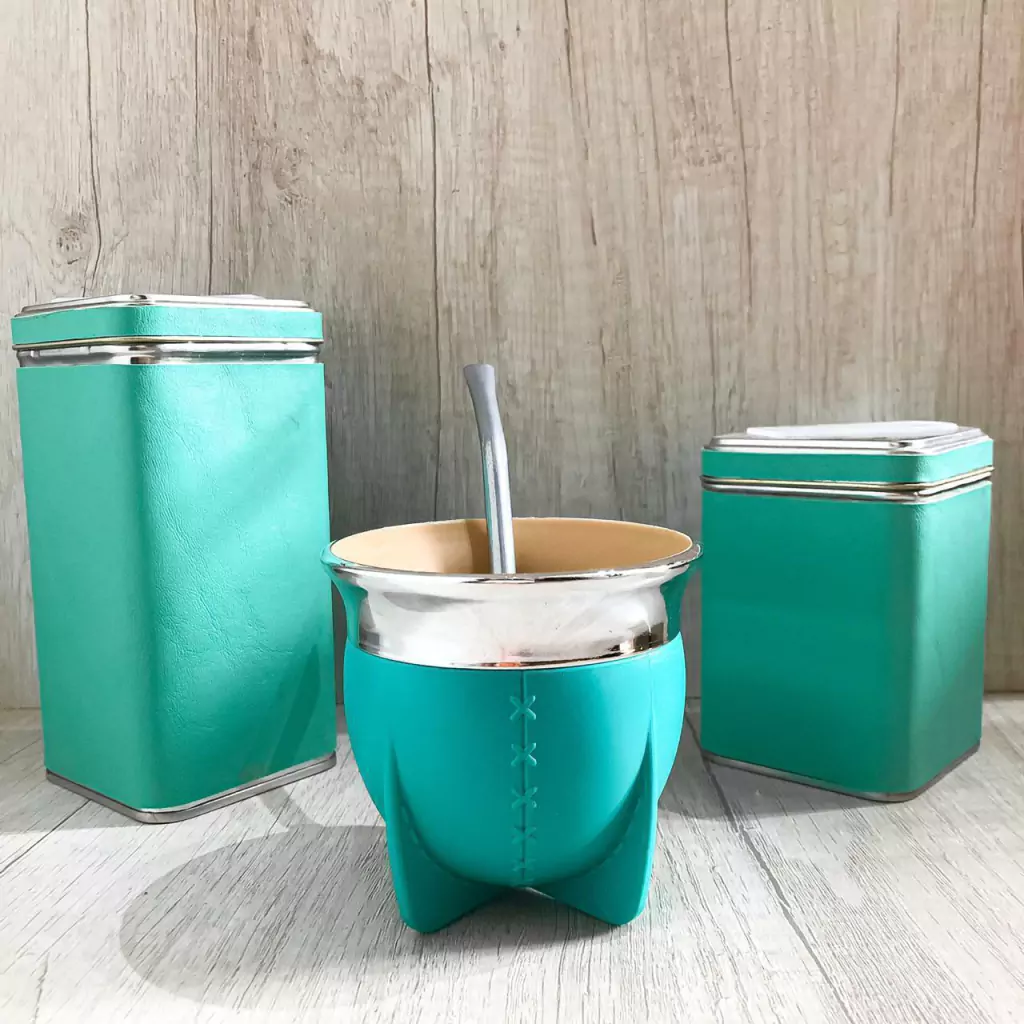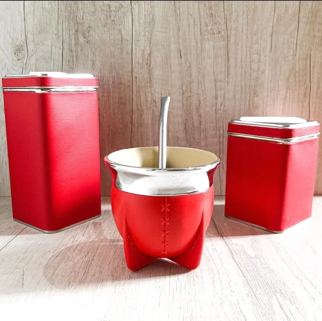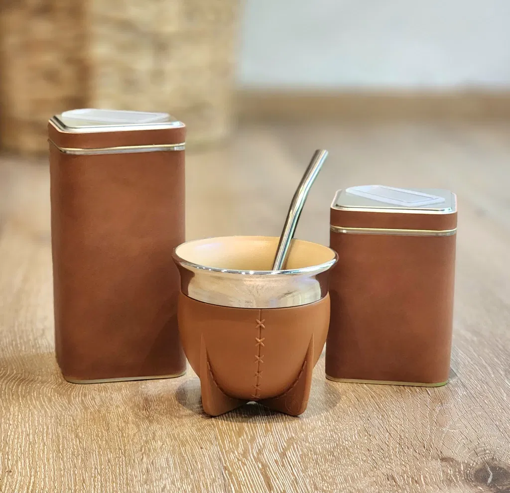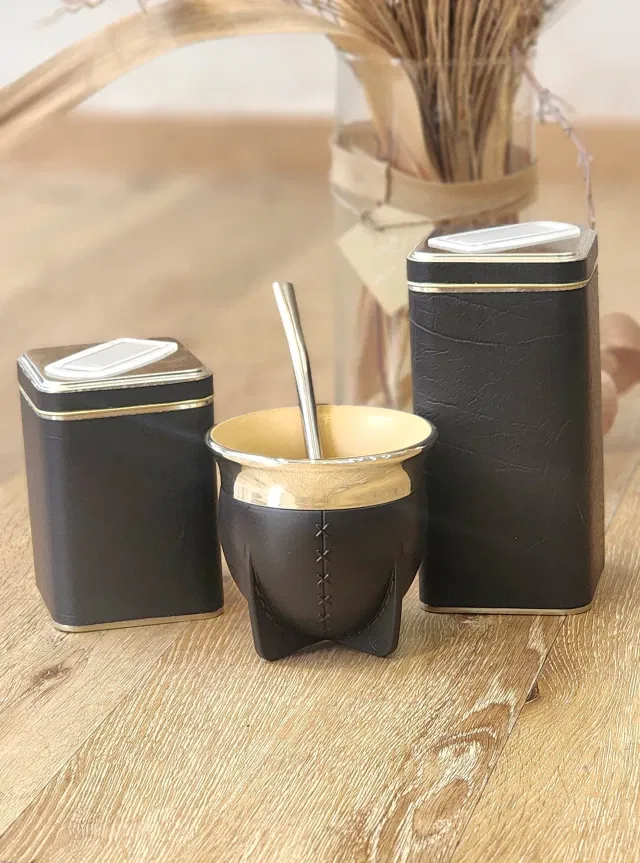Incluye: mate Pampa boca abierta (no se cura, no genera hongos, facil lavado) , bombila de acero inoxidable común, yerbera y azucarera de lata cuadrada forradas con cuerina!