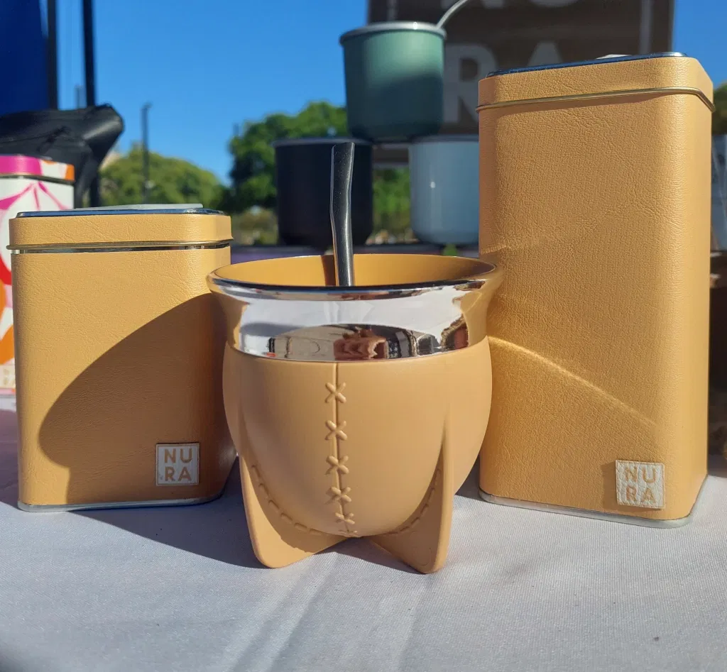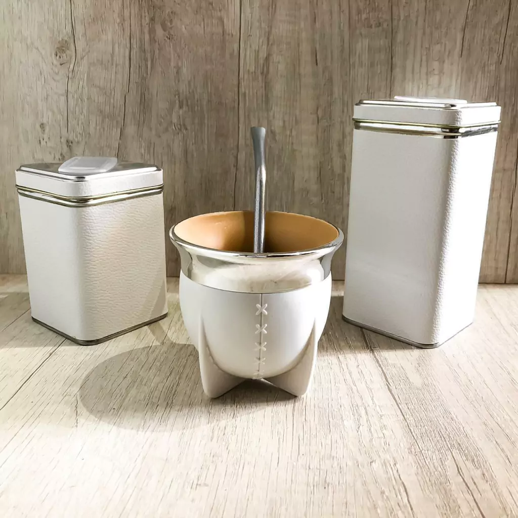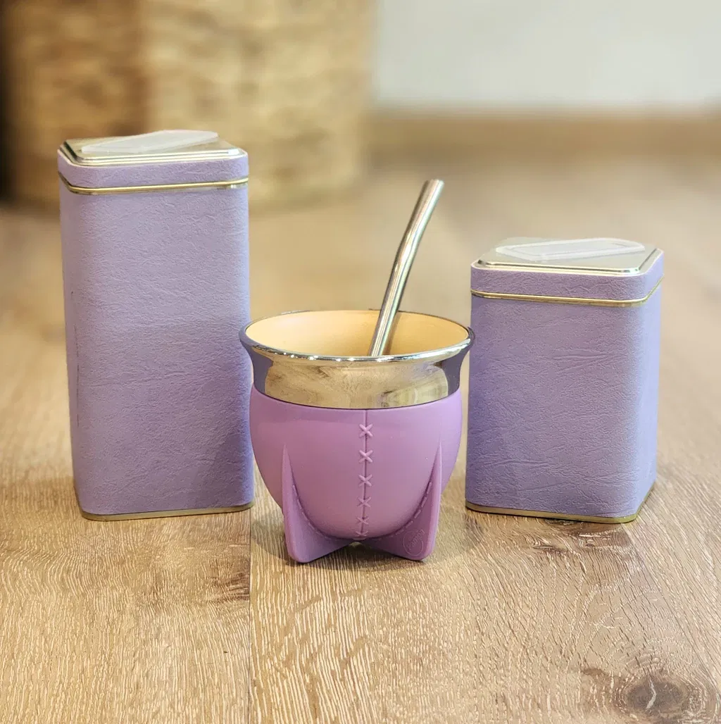 Incluye: mate Pampa boca abierta (no se cura, no genera hongos, facil lavado) , bombila de acero inoxidable común, yerbera y azucarera de lata cuadrada forradas con cuerina!