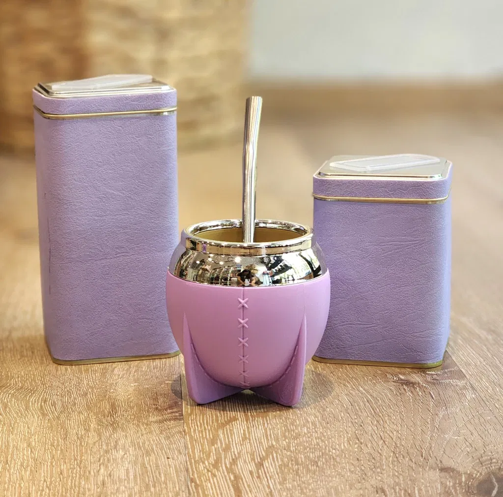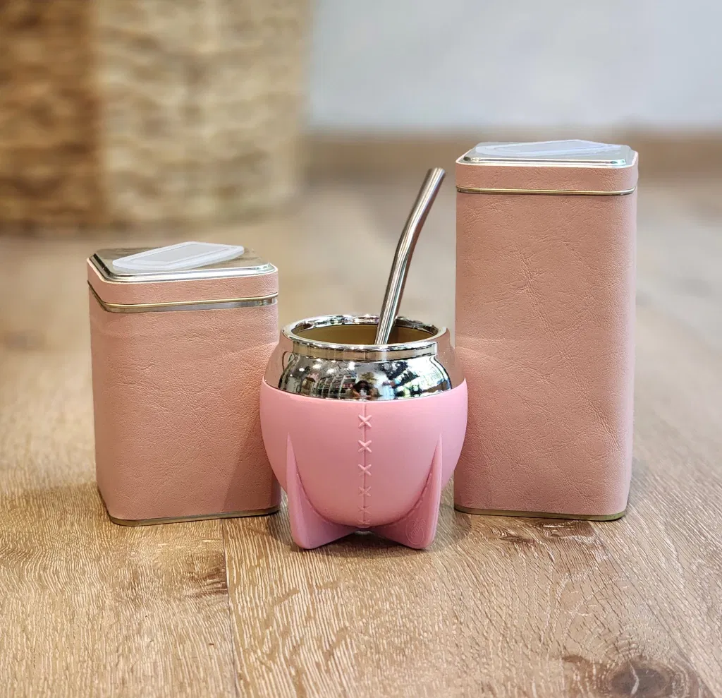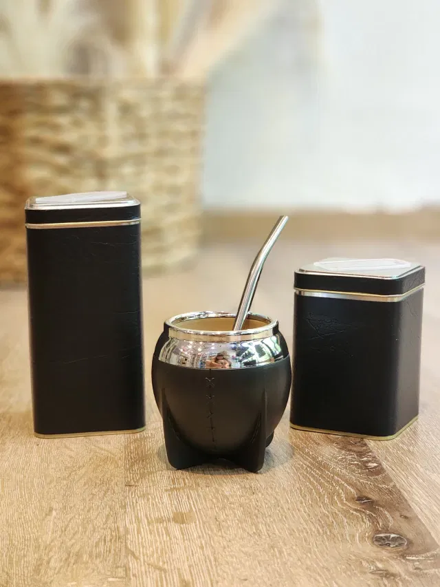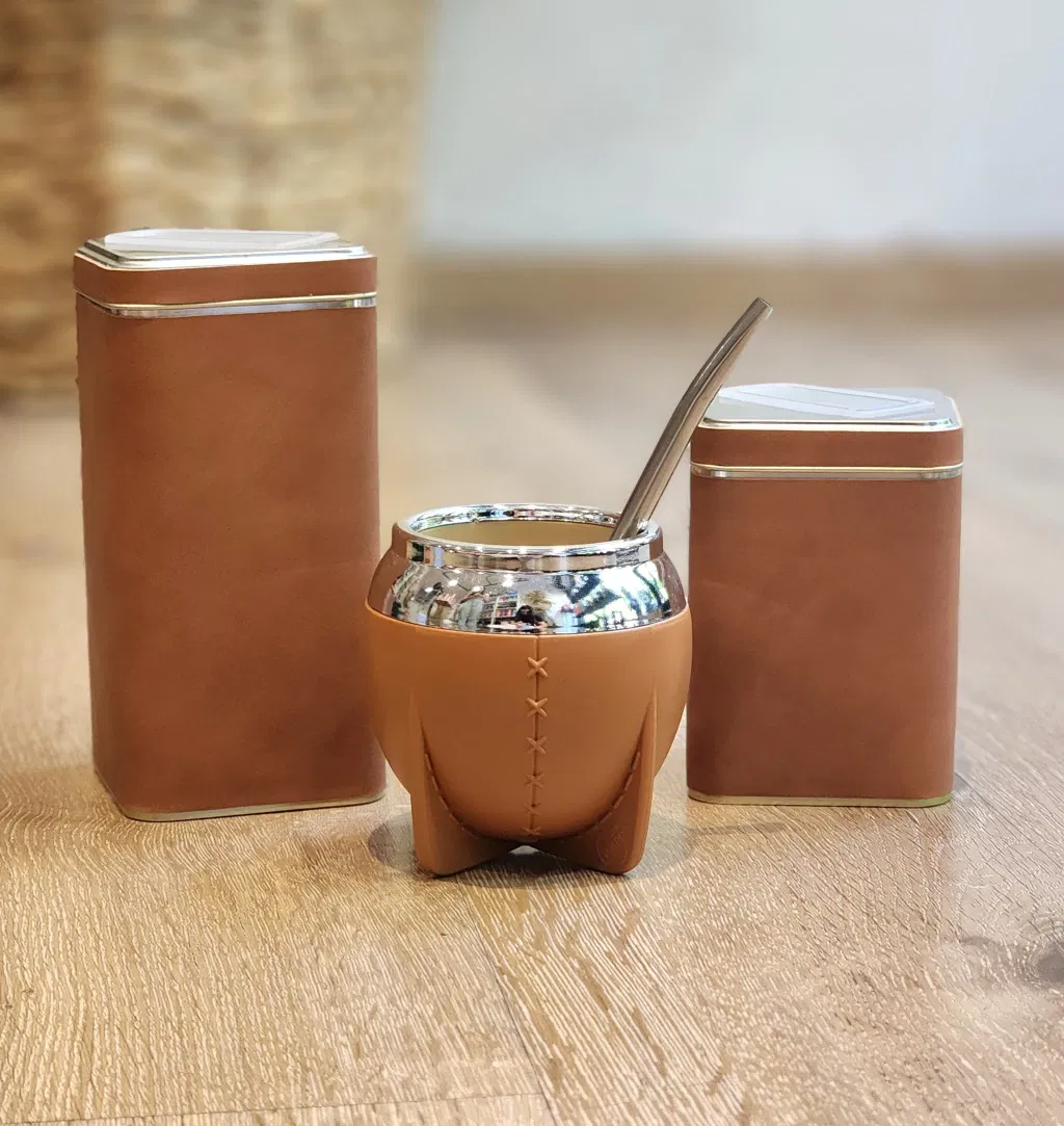 Incluye: mate Pampa boca cerrada (no se cura, no genera hongos, facil lavado) , bombila de acero inoxidable común, yerbera y azucarera de lata cuadradas forradas con cuerina!