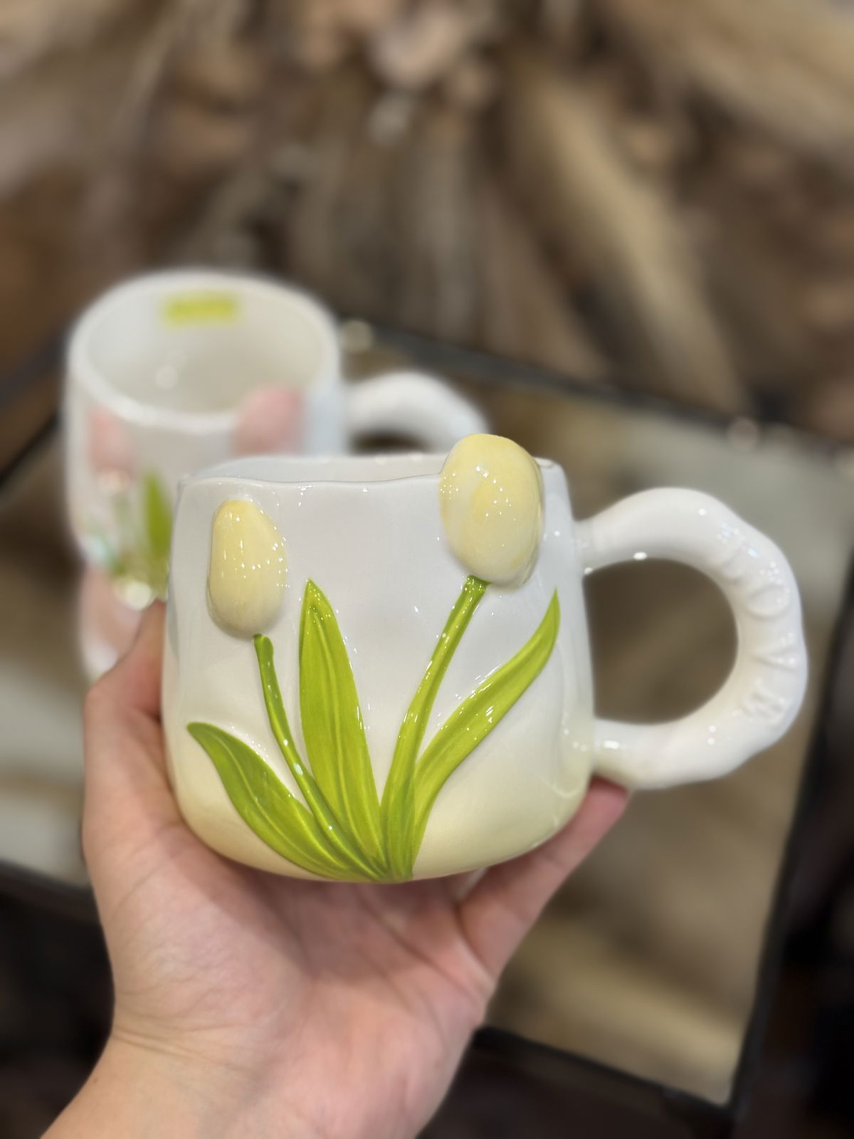 Taza de cerámica blanca con detalles en relieve de tulipanes