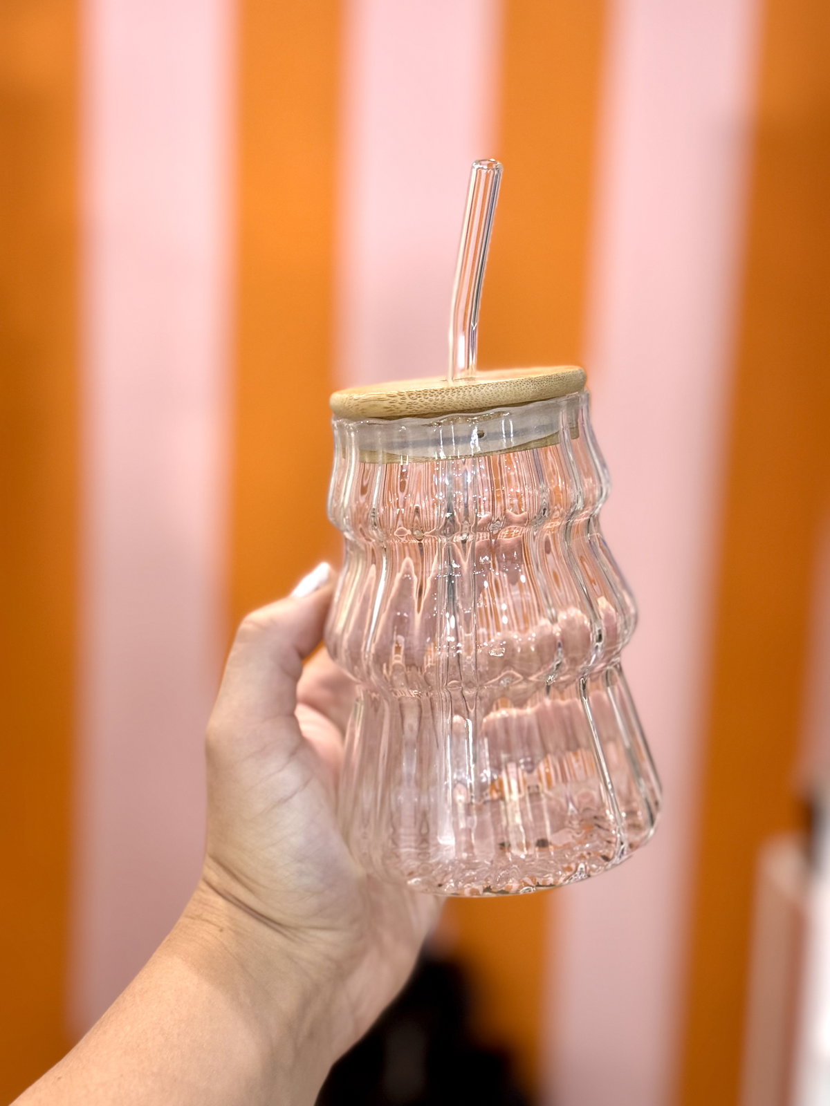 Vaso de vidrio grueso con sorbete de vidrio, esta opción SI incluye tapa de bambú. Ideales para tus bebidas frías, como licuados, cafés, jugos,etc.